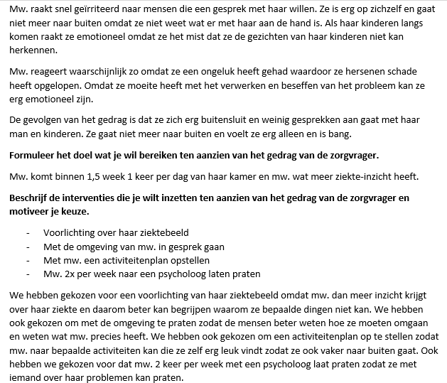 Wij hadden een casus over een mw. zij heeft een ongeluk gehad, hierdoor herkent mw. haar mensen in de omgeving niet meer. Als er tegen haar gepraat wordt kan mw. erg geïrriteerd reageren.
